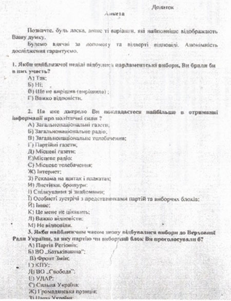 До доручення було додано анкету, більшість питань якої стосувалися політичних поглядів учителів, зокрема, за яку політичну партію чи блок вони проголосували б, чи голосуватимуть за ту ж політичну силу, що й на минулих виборах до Верховної Ради.