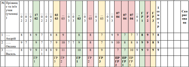 Якщо підсумкова робота була за однією групою результатів, то в колонці з відповідною датою виставляють оцінки і внизу колонки зазначають індекс цієї групи (див. Таблицю 1).