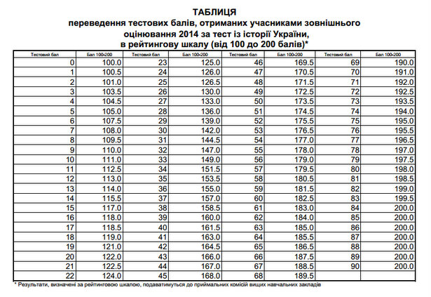 Таблиця переведення тестових балів з історії України у 200-бальну шкалу 2014 року: