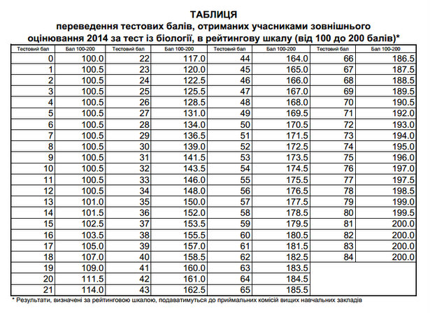 Таблиця переведення тестових балів з біології у 200-бальну шкалу 2014 року: