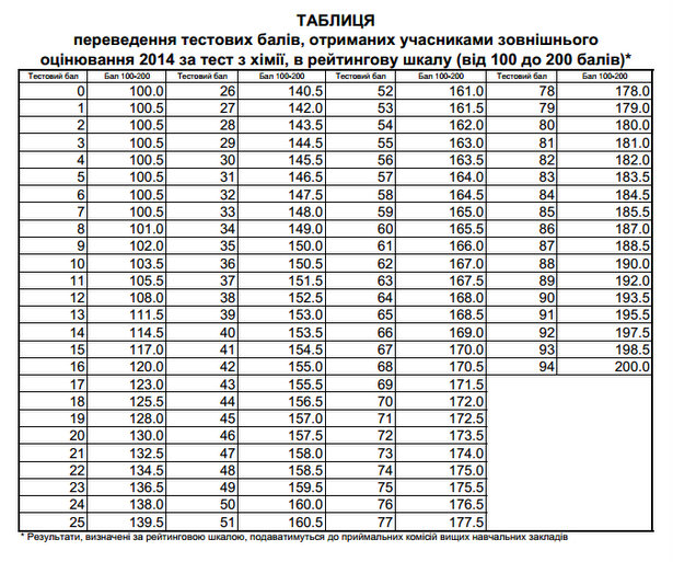 Таблиця переведення тестових балів з хімії у 200-бальну шкалу 2014 року: