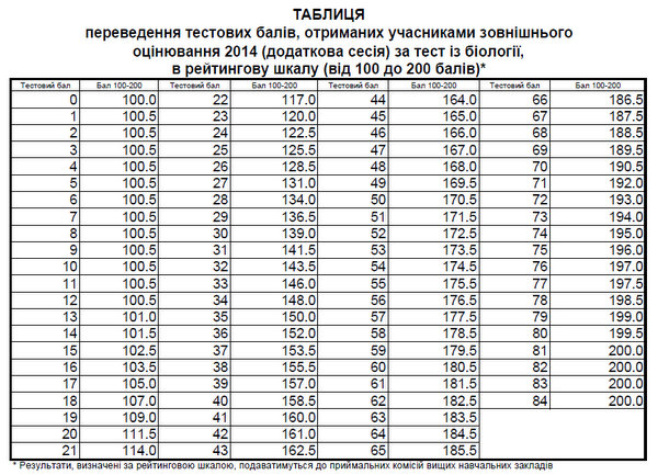 Таблиця переведення тестових балів з біології у 200-бальну шкалу 2014 року (додаткова сесія):