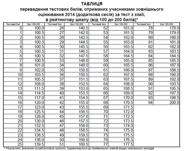 Таблиця переведення тестових балів з хімії у 200-бальну шкалу 2014 року (додаткова сесія):