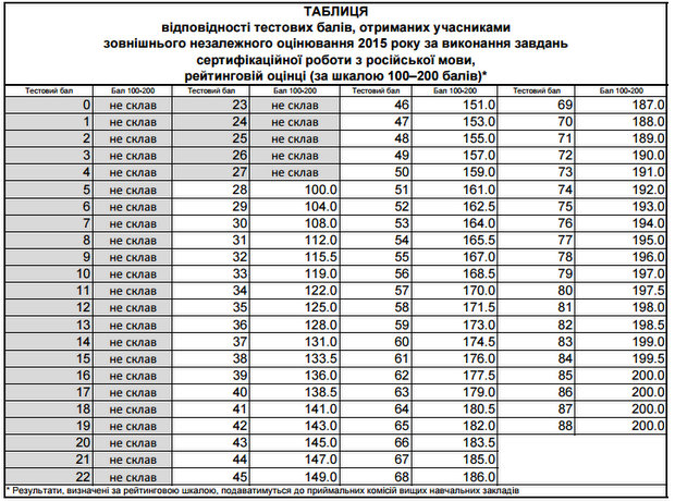Таблиця переведення тестових балів з російської мови у 200-бальну шкалу 2015 року:
