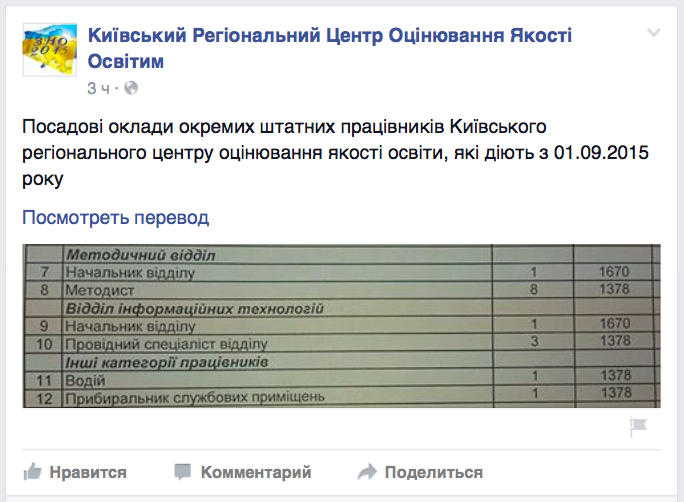 Київський регіональний центр оцінювання якості освіти оприлюднив на своїй сторінці у Facebook посадові оклади окремих шататних працівників.