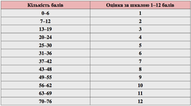 Таблиця переведення тестових балів з біології у шкалу 1-12 балів: