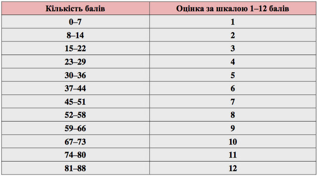 Таблиця переведення тестових балів з російської мови у шкалу 1-12 балів: