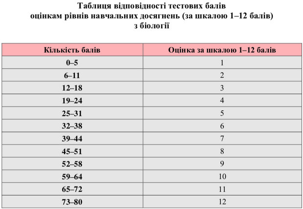 Таблиця переведення тестових балів з біології у шкалу 1-12 балів: