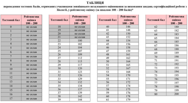 Оскільки результати зовнішнього оцінювання з біології можуть бути враховані як державна підсумкова атестація за шкільний курс з біології. Відповідно, Українським центром оцінювання якості освіти складено та затверджено окрему таблицю переведення тестових балів у шкалу 1-12 балів.
