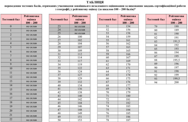 Таблиця переведення тестових балів з географії у 200-бальну шкалу:
