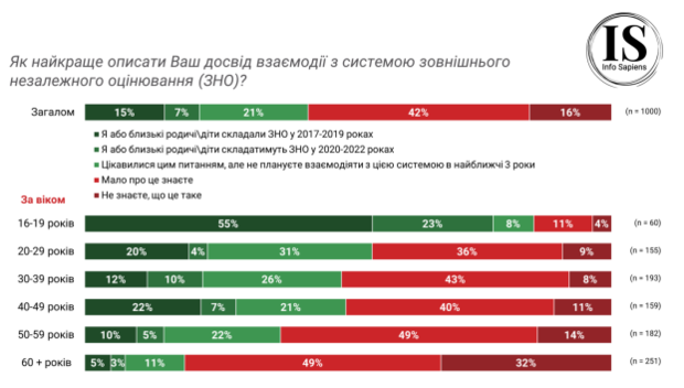 Загалом, досвід взаємодії з системою зовнішнього незалежного оцінювання (ЗНО) за 2017-2019 рр. має 15% опитаних, ще 7% планують взаємодіяти в 2020-2022 рр. — вони самі або їхні родичі/діти складатимуть ЗНО. Таких людей очікувано більше у віковий категорії 16-19 років.