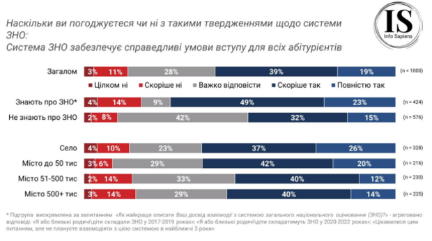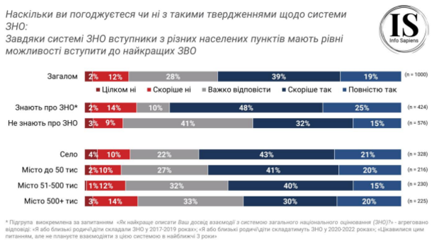 58% опитаних погоджуються, що завдяки системі ЗНО вступники з різних населених пунктів мають рівні можливості вступити до найкращих ЗВО. У селах і невеликих містах з цим погоджуються майже дві третини опитаних (62%-64%), у містах 50-500 тис. жителів та понад 500 тис. жителів з цим погоджується кожен другий (50%-55%). Водночас, аналогічно до попереднього твердження, поінформовані про систему ЗНО схильні більшою мірою погоджуватися, що ця система дає рівні можливості для всіх абітурієнтів вступити до найкращих ЗВО — серед поінформованих погоджуються з цим 73%, тоді як серед непоінформованих — 47%, а 41% сказали, що їм важко відповісти на таке питання.