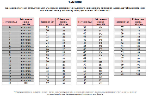 Таблиця переведення тестових балів з англійської мови у 200-бальну шкалу: