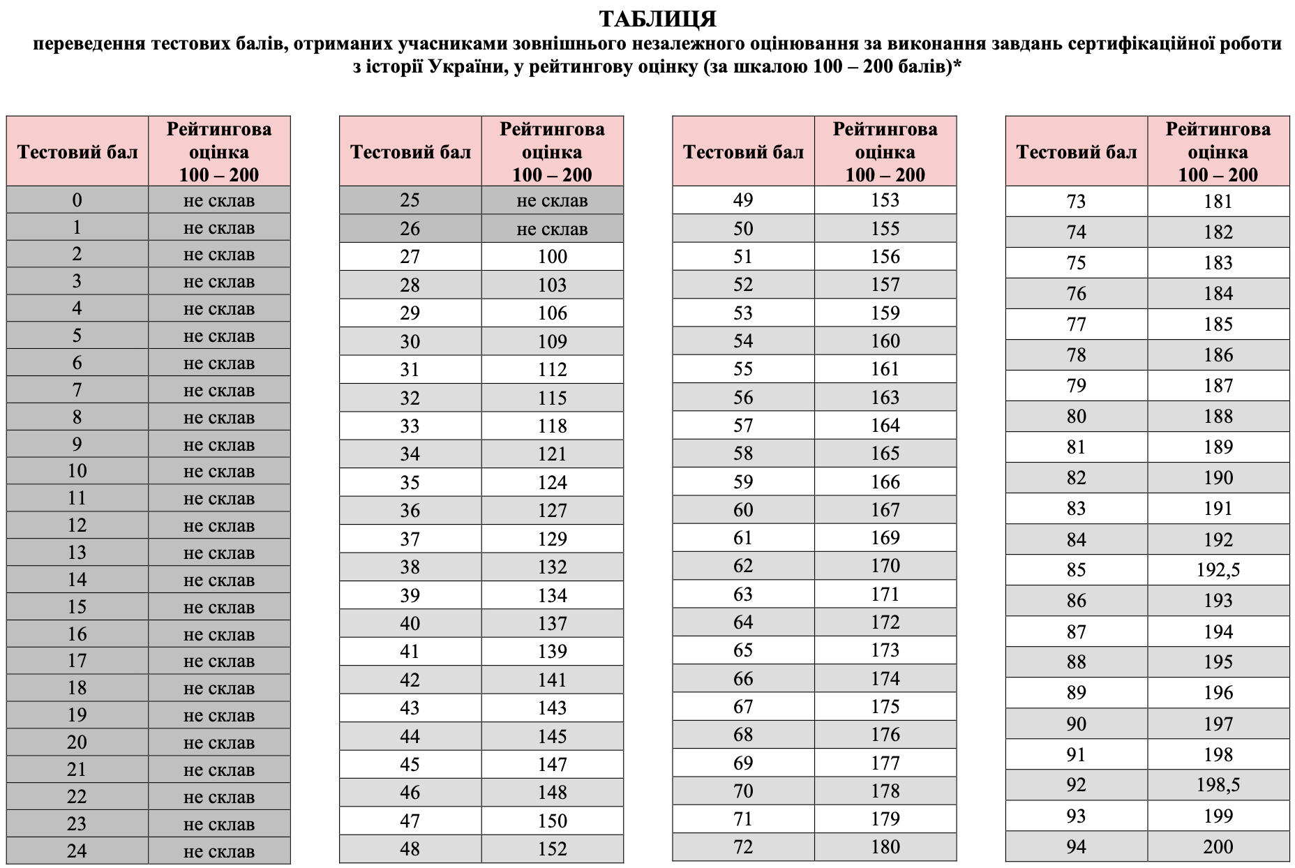 Таблиця переведення тестових балів з історії України у 200-бальну шкалу: