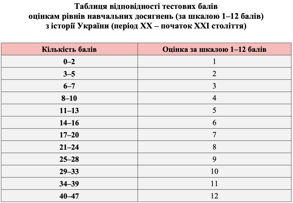 Таблиця переведення тестових балів з історії України у шкалу 1-12 балів: