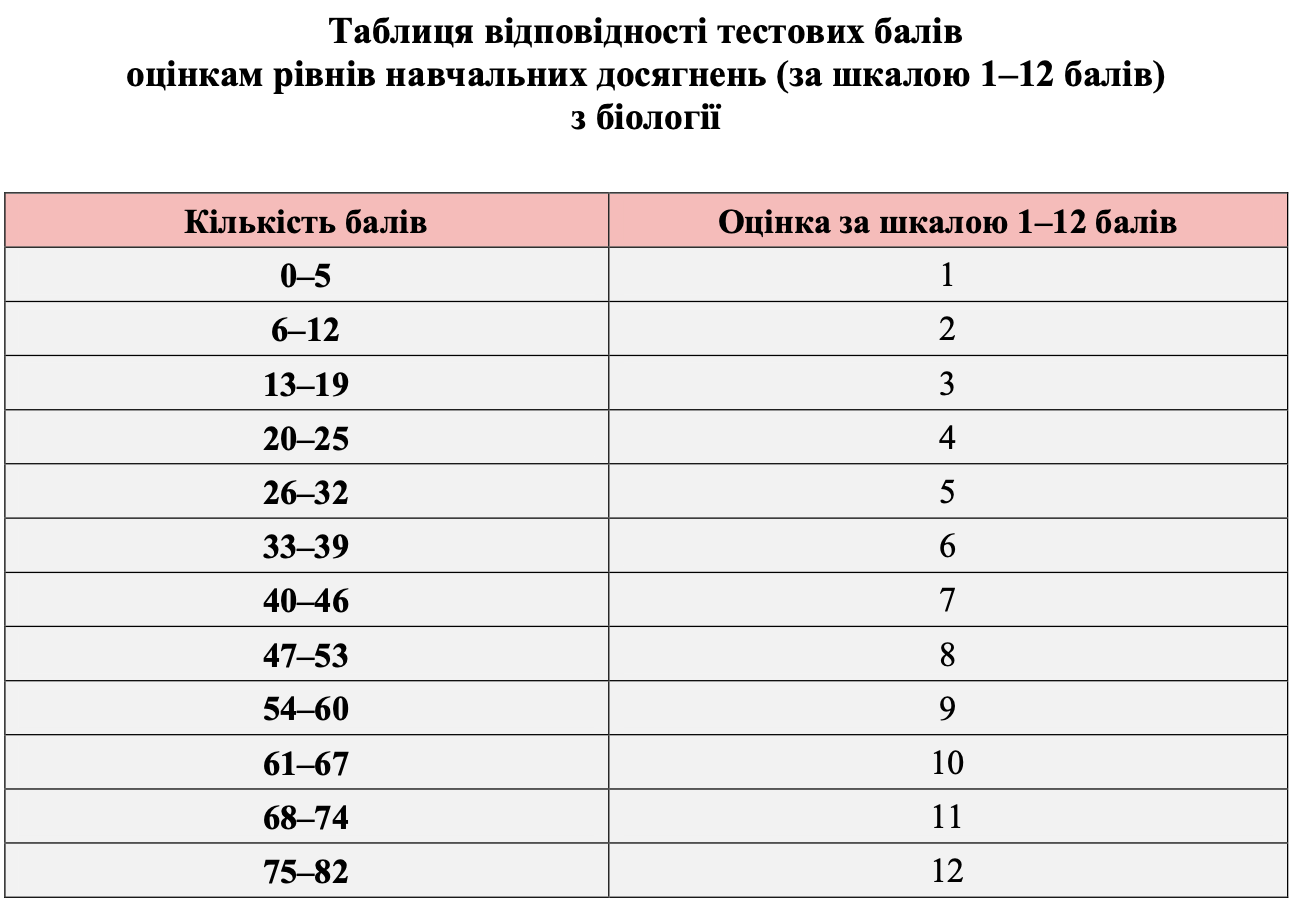 Таблиця переведення тестових балів з біології у шкалу 1-12 балів: