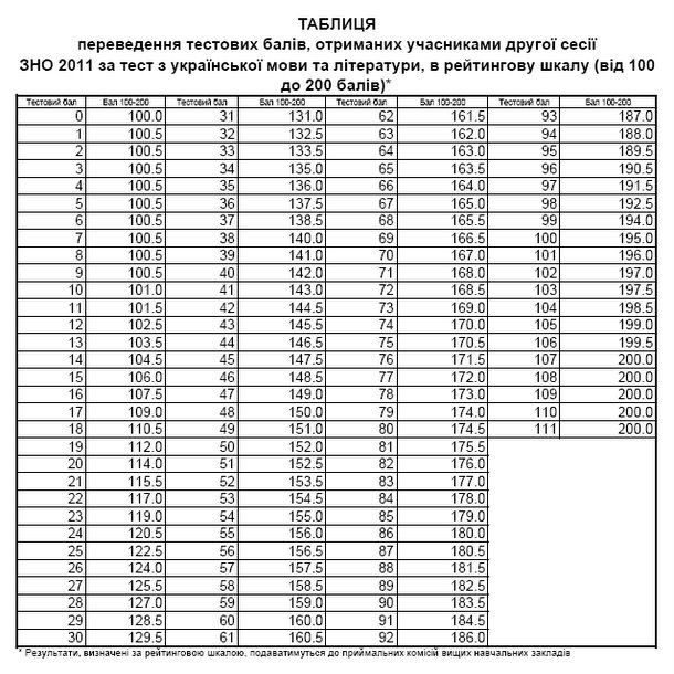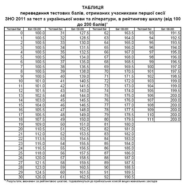 Таблиці переведення тестових балів у 200-бальну шкалу: