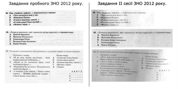 Зокрема, завдання тесту другої сесії з української мови і літератури за №№46, 48, та 59 (перший тестовий зошит) були ідентичними із завданнями пробного тестування з української мови та літератури, що було проведено у березні цього року (завдання №№46, 48 та 57 пробного тесту).