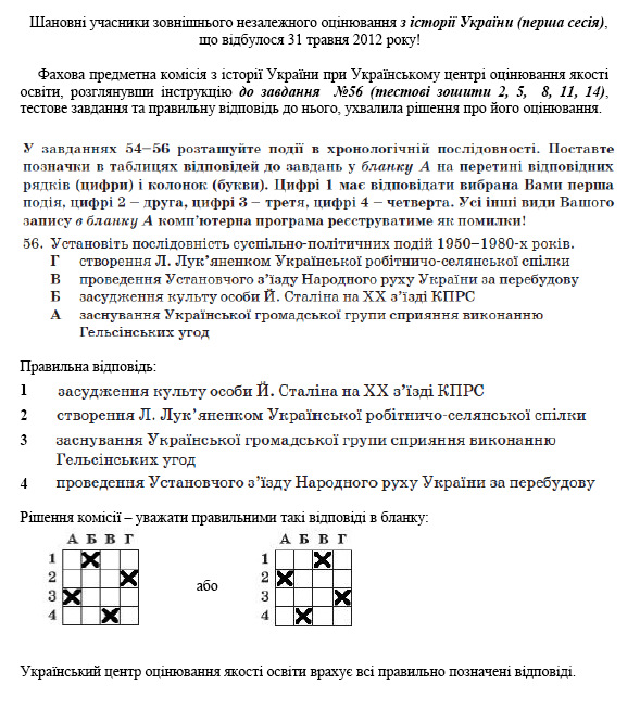 За рішенням фахової предметної комісії з історії України, засідання якої відбулося 31 травня, при визначенні результатів тесту завдання №56 буде мати подвійну правильну відповідь.