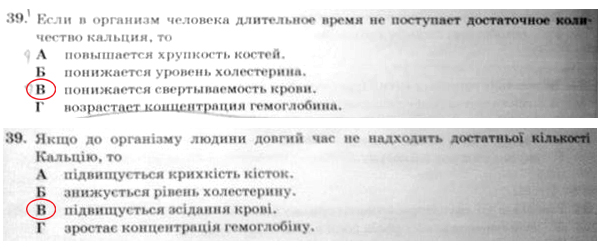 Крім того, в одному із завдань російськомовного тестового зошита з біології було неправильно перекладено один із варіантів відповідей. Зокрема, в україномовному зошиті один з варіантів відповіді був викладений як "підвищується зсідання крові", а в російськомовному ‑ "понижается свертываемость крови".