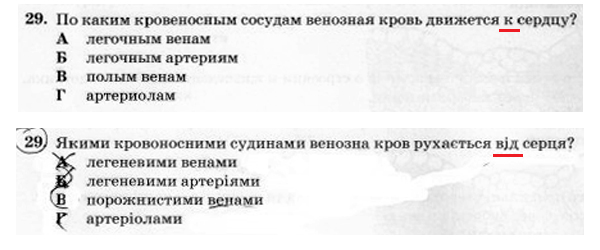 Так, у одному із завдань неправильно було перекладено умову завдання. Зокрема, в україномовному тестовому зошиті умова одного із завдань була викладена наступним чином: "Якими кровоносними судинами венозна кров рухається від серця", натомість у російськомовному зошиті умова цього завдання містила протилежний смисл, оскільки в абітурієнтів запитали, яким чином рухається кров до серця.