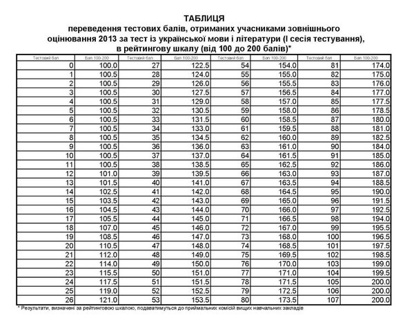 Таблиця переведення тестових балів з української мови і літератури у 200-бальну шкалу 2013 року (І сесія):