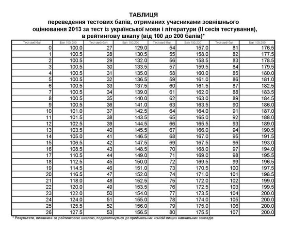 Таблиця переведення тестових балів з української мови і літератури у 200-бальну шкалу 2013 року (ІІ сесія):