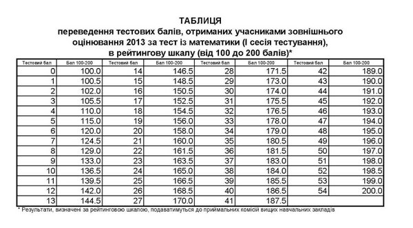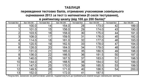 Таблиці переведення тестових балів з математики у 200-бальну шкалу 2013 року:
