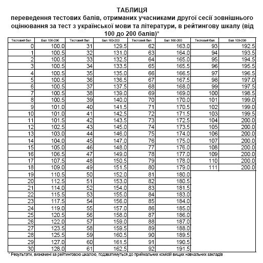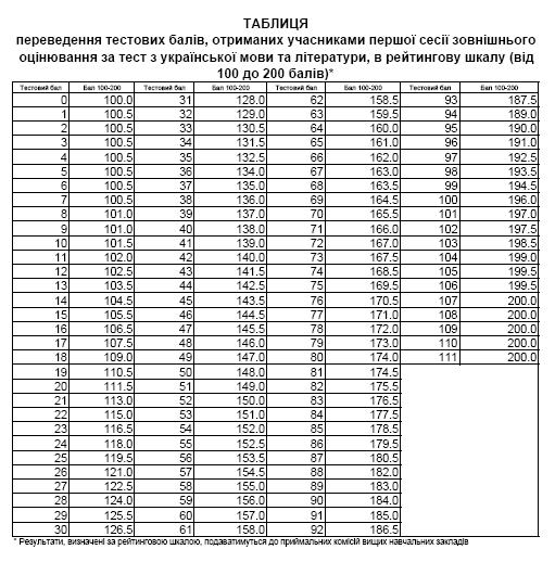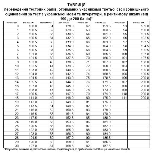 Таблиці переведення тестових балів у 200-бальну шкалу: