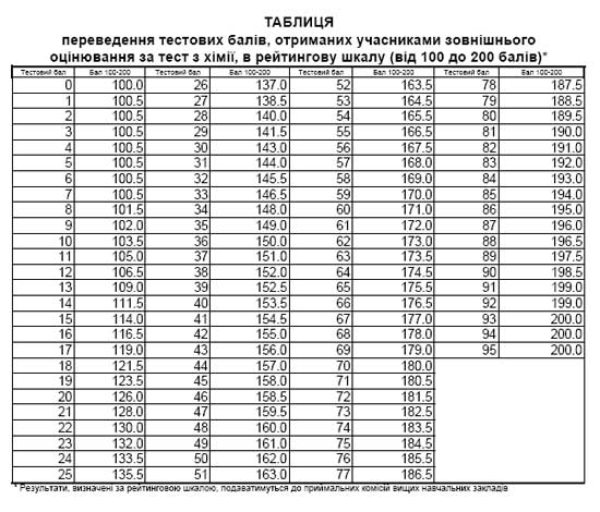 Таблиця переведення тестових балів у рейтингову 200-бальну шкалу: