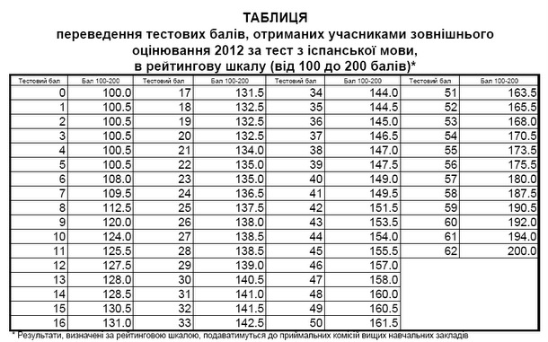 За результатами тестування Українським центром оцінювання якості освіти оприлюднена таблиця відповідності кількості тестових балів, отриманих учасниками зовнішнього незалежного оцінювання за тест з іспанської мови у 2012 році, у рейтингову шкалу (100–200 балів).