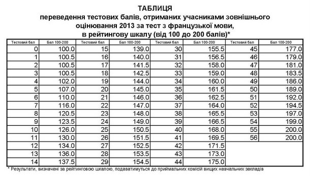 За результатами тестування Українським центром оцінювання якості освіти оприлюднена таблиця переведення тестових балів, отриманих учасниками зовнішнього незалежного оцінювання за тест з французької мови у 2013 році, у рейтингову шкалу (100–200 балів).