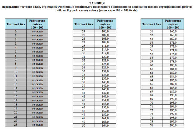 За результатами тестування Українським центром оцінювання якості освіти оприлюднена таблиця переведення тестових балів, отриманих учасниками зовнішнього незалежного оцінювання за тест з біології у 2016 році, у рейтингову шкалу (100–200 балів).