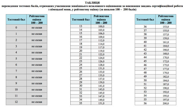 За результатами тестування Українським центром оцінювання якості освіти оприлюднена таблиця переведення тестових балів, отриманих учасниками зовнішнього незалежного оцінювання за тест з німецької мови у 2016 році, у рейтингову шкалу (100–200 балів).