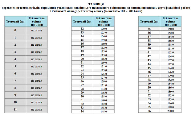 За результатами тестування Українським центром оцінювання якості освіти оприлюднена таблиця переведення тестових балів, отриманих учасниками зовнішнього незалежного оцінювання за тест з іспанської мови у 2016 році, у рейтингову шкалу (100–200 балів).