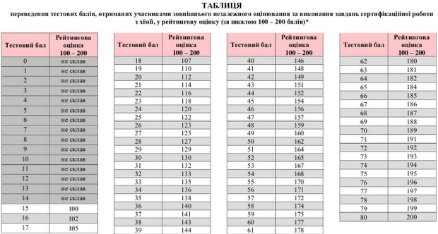 За результатами тестування Українським центром оцінювання якості освіти оприлюднена таблиця переведення тестових балів, отриманих учасниками зовнішнього незалежного оцінювання, у рейтингову шкалу (100–200 балів).