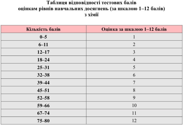 Також, Українським центром оцінювання якості освіти оприлюднена таблиця переведення тестових балів, отриманих учасниками зовнішнього незалежного оцінювання, у шкалу 1-12 балів.