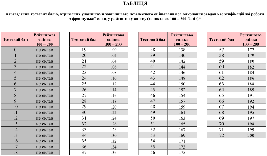 За результатами тестування Українським центром оцінювання якості освіти оприлюднена таблиця переведення тестових балів, отриманих учасниками зовнішнього незалежного оцінювання за тест з французької мови у 2019 році, у рейтингову шкалу (100–200 балів).