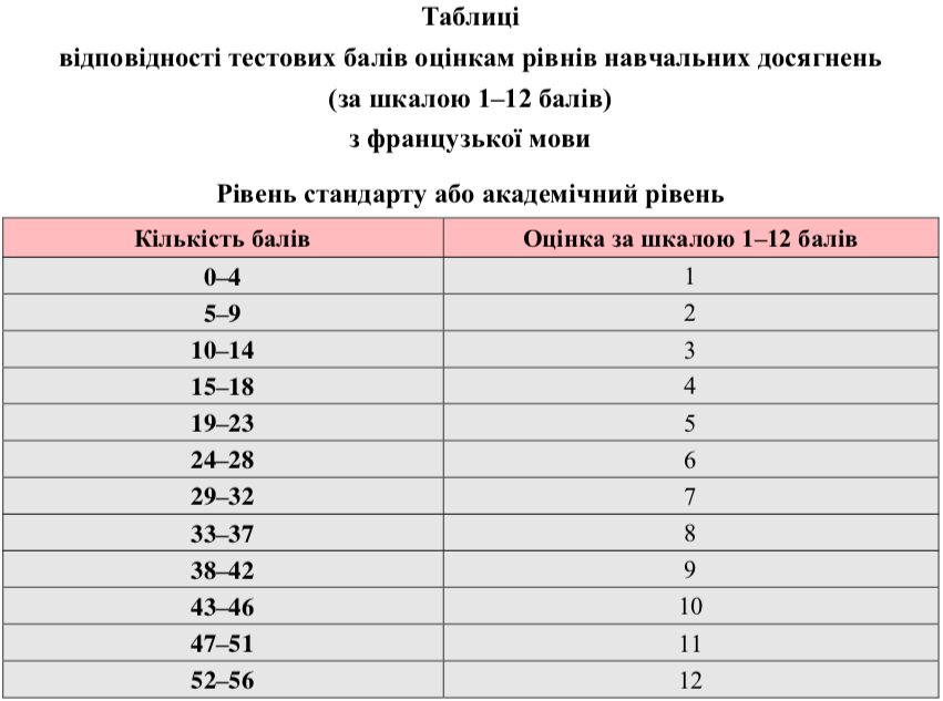 Також Українським центром оцінювання якості освіти оприлюднена таблиця переведення тестових балів, отриманих учасниками зовнішнього незалежного оцінювання за тест з французької мови у 2019 році, у шкалу 1-12 балів.