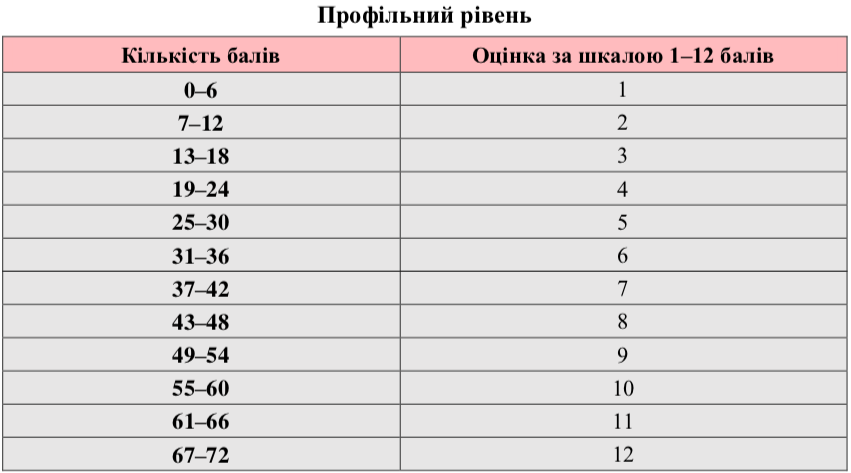 Таблиці переведення тестових балів у рейтингову шкалу 100-200 балів та шкалу 1-12 балів