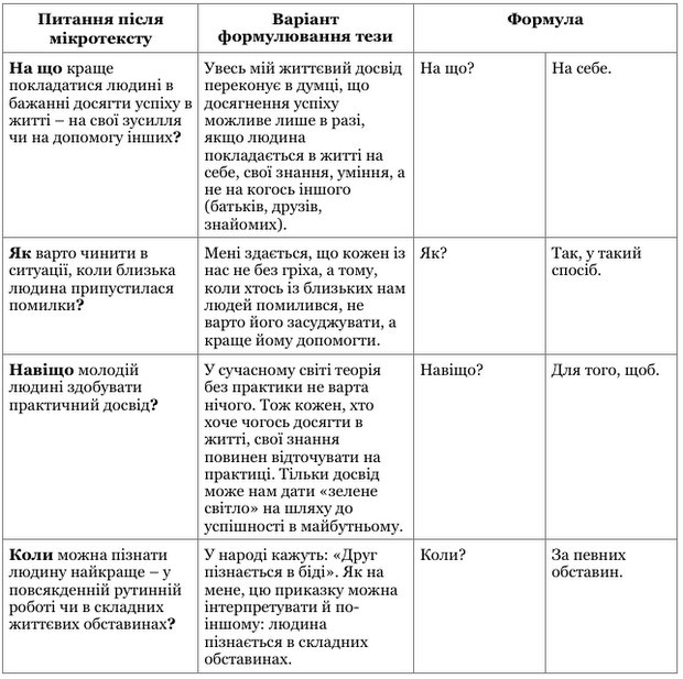 Наприклад, якщо в завданні після мікротексту питання починається зі слова ЯК?, то, закономірно, що у відповіді-тезі треба сказати – У ТАКИЙ СПОСІБ, а не ТОДІ, якщо КОЛИ? – то у відповіді-тезі варто сказати ТОДІ, а не, скажімо, ТАМ.
