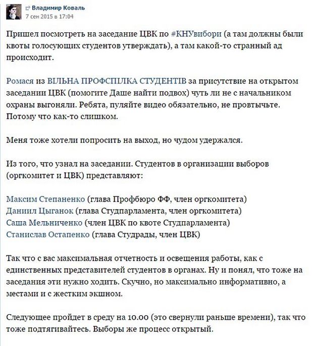 "Нам зрозуміло одне: вибори ректора повинні бути максимально чесними і демократичними, так що такі історії з ЦВК і адміністративним ресурсом потрібно свідомо запобігати. Так побудуємо громадянське суспільство. Так переможемо", - написали студенти "ШеваПил", які хочуть брати участь у виборах ректора.