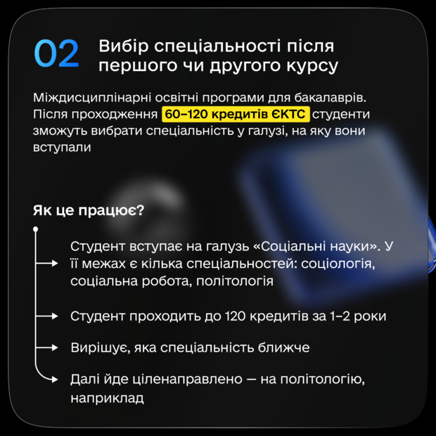 Після проходження 60–120 кредитів ЄКТС студенти зможуть вибрати спеціальність у межах широкої галузі. Наприклад, вибираєте галузь «Соціальні науки», навчаєтеся 2 роки, а потім можете визначитися, яка галузь вам найбільше підходить – соціологія, соціальна робота чи політологія.