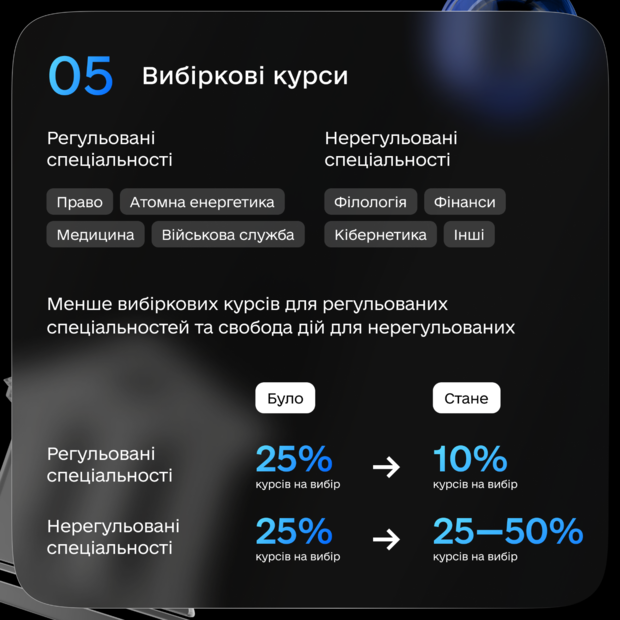 Для студентів, які навчаються на регульованих спеціальностях (право, медицина, військова служба, атомна енергетика тощо), вдосконалюються стандарти навчання.