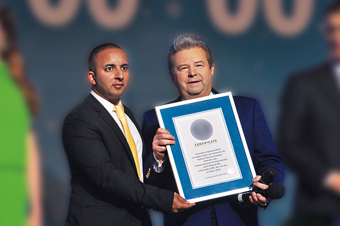 Офіційний суддя Книги рекордів Гіннеса Він Шарма вручає сертифікат про новий світовий рекорд української пісні Михайлу Поплавському