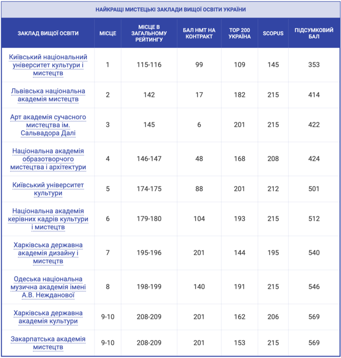 Інформаційний ресурс «Освіта.ua» представив мистецькі виші, які посіли найвищі місця в консолідованому рейтингу закладів вищої освіти України 2024 року.