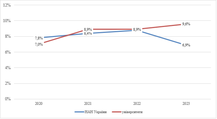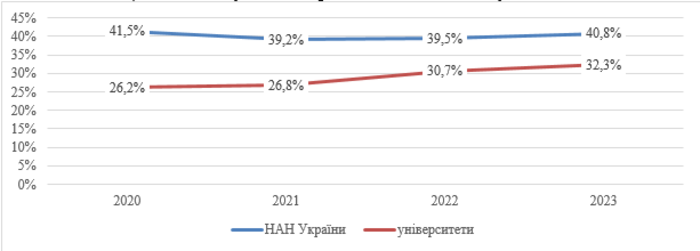 У 2020–2023 роках відсоток статей, написаних у співавторстві з іноземними науковцями, зменшився з 41,5% до 40,8% у науковому доробку НАН України і зріс з 26,2% до 32,3% у науковому доробку університетів.