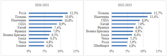 У 2022–2023 роках відсоток статей, написаних у співавторстві з польськими науковцями, був найвищим як для НАН України, так і для університетів. Статті, написані у співавторстві з російськими науковцями, є результатом як двосторонньої, так і багатосторонньої співпраці. Водночас науковці університетів активно співпрацювали з колегами зі Словаччини.