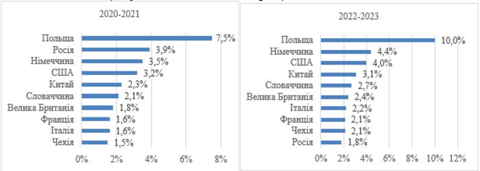 Tоп 10 країн міжнародної співпраці українських університетів (відсоток статей від загальної кількості, опублікованої в даний період)