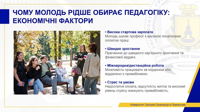 Молоді люди прагнуть професій, де є висока стартова зарплата, швидке зростання, відчутна фінансова віддача та можливість працювати міжнародно або дистанційно. Педагогічна професія у більшості регіонів не може цього забезпечити.